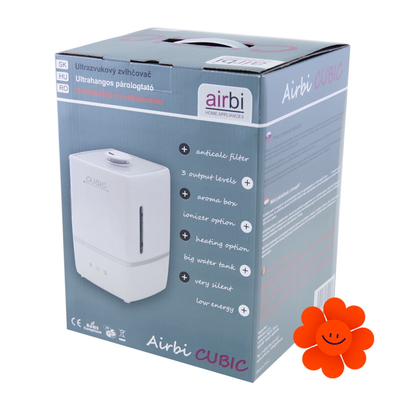Výhodou ultrazvukového zvlhčovača CUBIC je vysoký výkon pri velmi nízkej spotřebe elektrickej energie. Zvlhčovač Airbi CUBIC vypúšťa čistú a sviežu paru do ovzdušia. Pomocou antibakteriálneho a vodného filtra zachytáva minerálne látky obsiahnuté vo vode a zabraňuje dalšiemu rozptylovaniu týchto častíc.