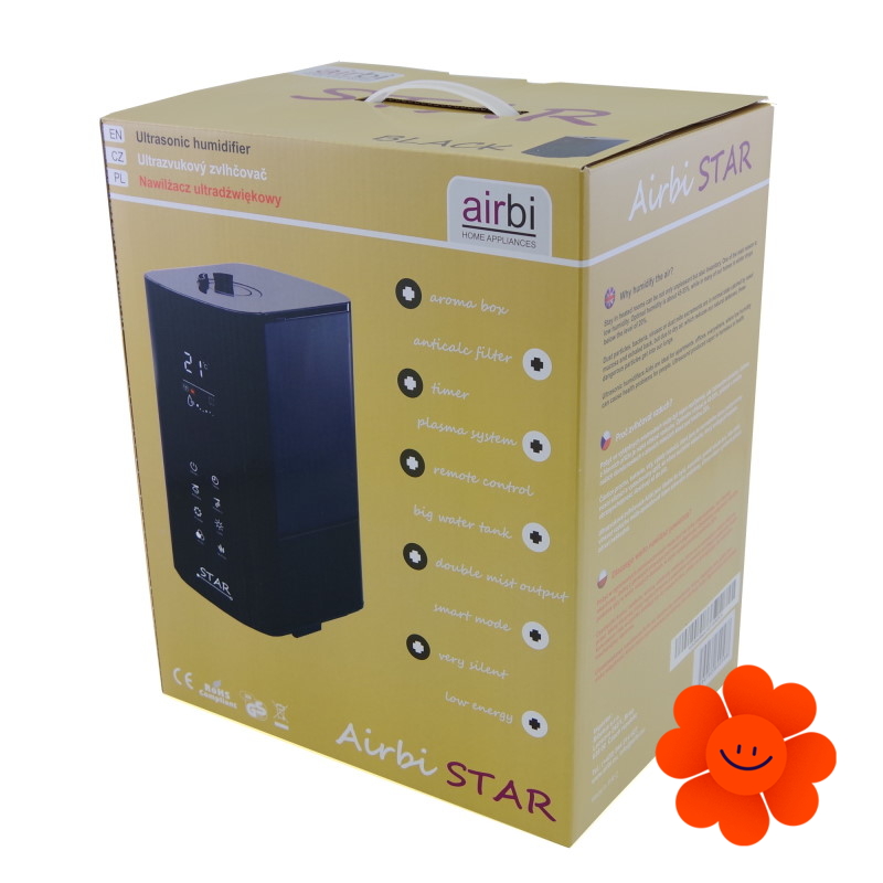 Ultrazvukový zvlhčovač vzduchu Airbi STAR pre čisté a zdravé ovzdušie vám pomôže zaistit optimálne klimatické podmienky v domácnosti. Model STAR patrí mezi viacúčelové prístroje (3 zariadenia v 1), lebo okrem základnej funkcie zvlhčovania vzduchu, je vybavený tiež PLASMA systémom (pomáhá čistit ovzdušie) a aromaboxom, do kterého má užívatel možnost pridávat esenciálne oleje a využívať tak priaznivé účinky aromaterapie.