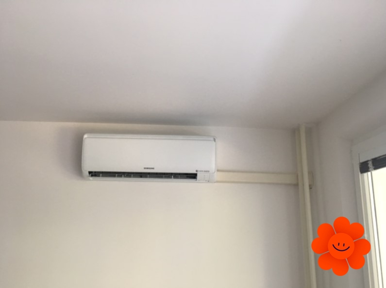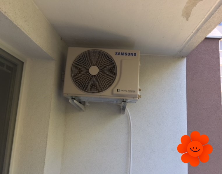 Montáž klimatizácie Samsung Maldives do rohu v byte blízko k balkónu. Rozvody vedú cez stenu k vonkajšej jednotke umiestnenej na konzolách vo výške pod stropom.