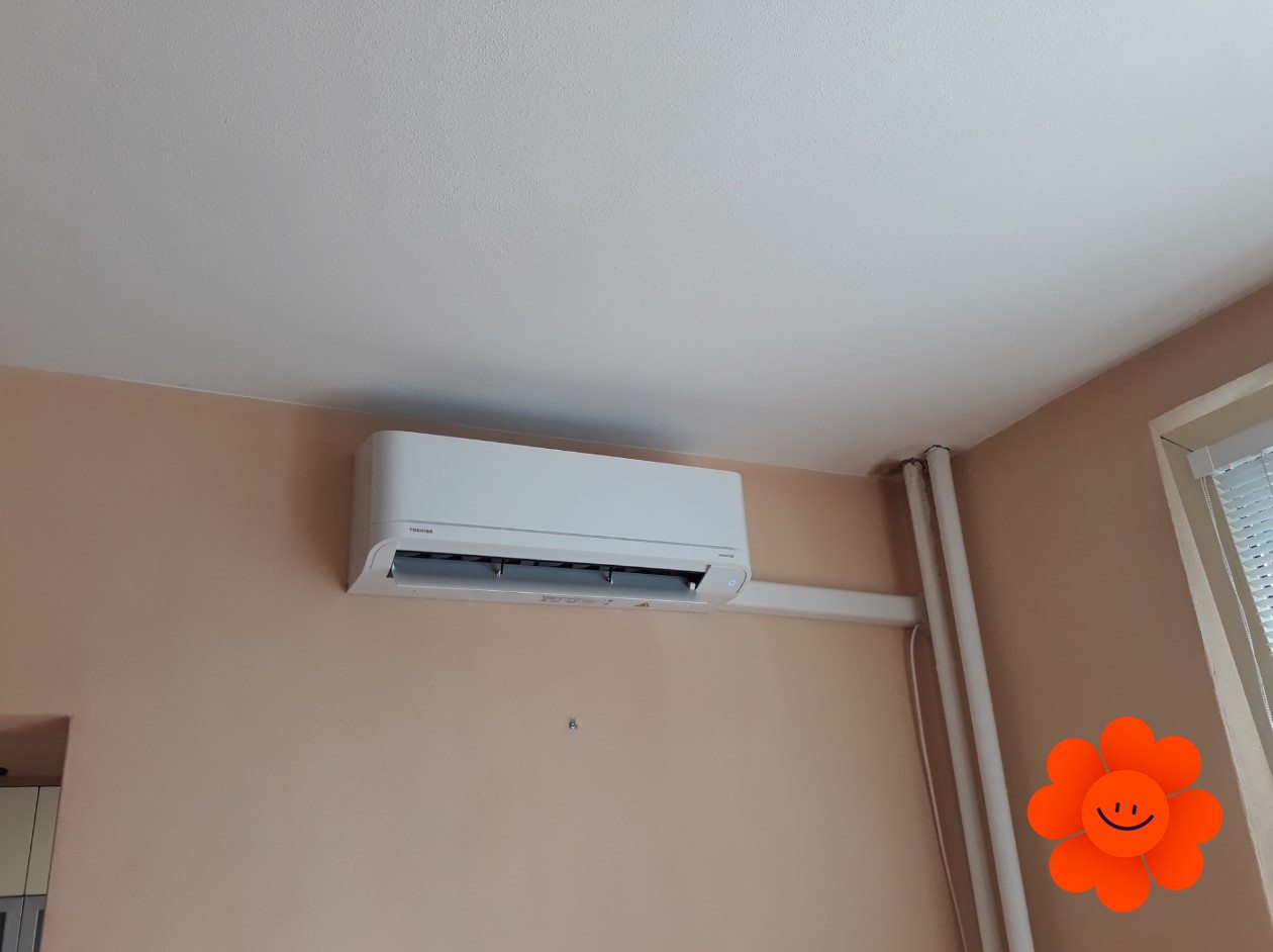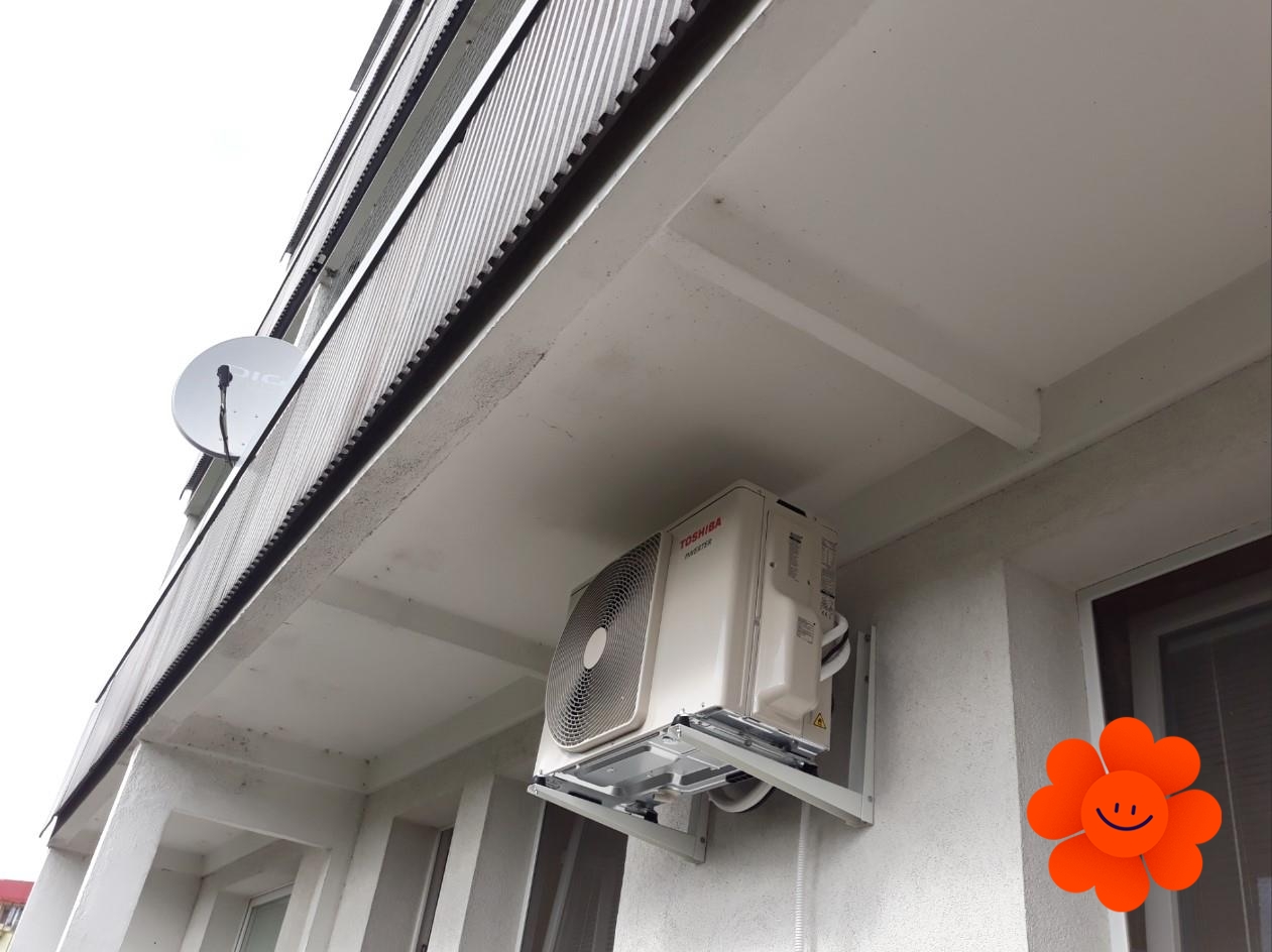Montáž klimatizácie Toshiba Suzumi Plus do rohu v byte. Rozvody v plastovom potrubí vedené cez stenu k vonkajšej jednotke uchytenej na konzolách vo výške.