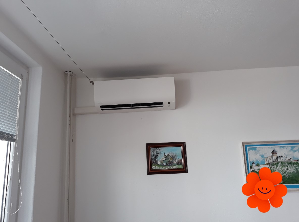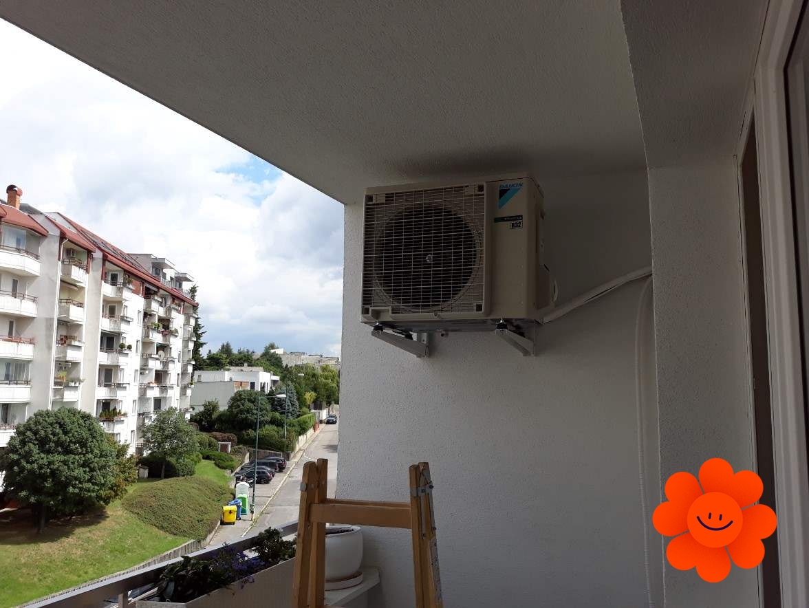 Montáž klimatizácie Daikin Comfora do bytu blízko balkóna. Rozvody vedú cez stenu plastovým potrubím k vonkajšej jednotke ukotvenej na konzolách.