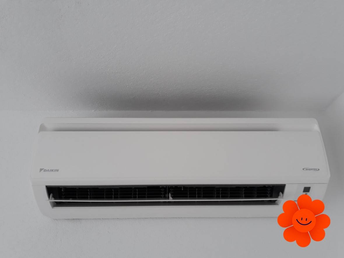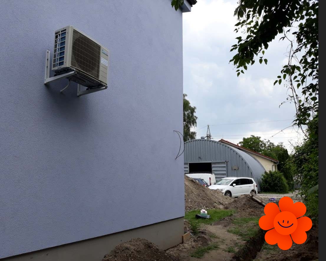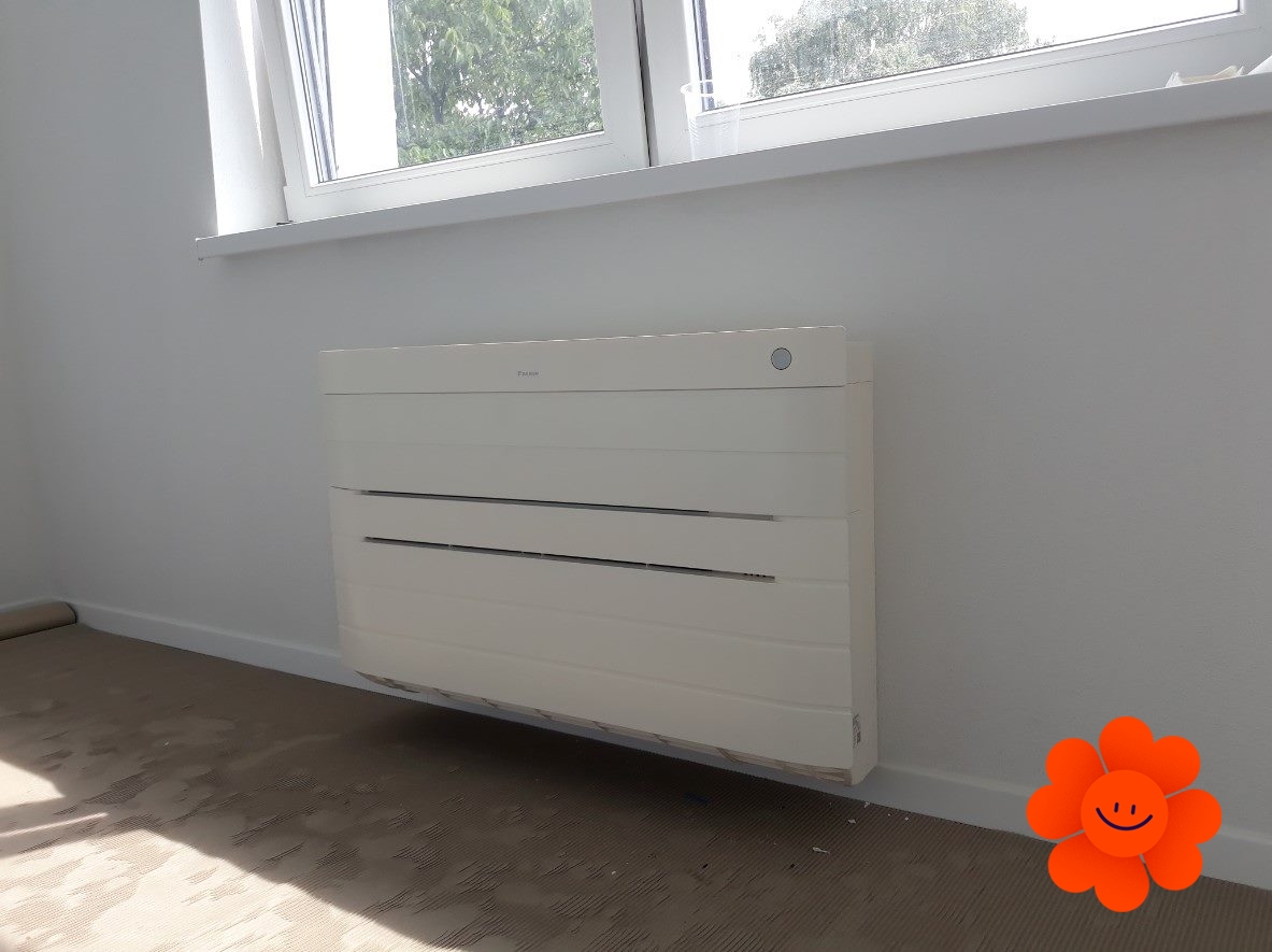 Montáž klimatizácie Daikin Eco Comfort do rohu steny a parapetnej klimatizácie Daikin Nexura FVXG25K + RXG25L. Rozvody z oboch jednotiek vedú cez stenu priamo k vonkajšej jednotke,