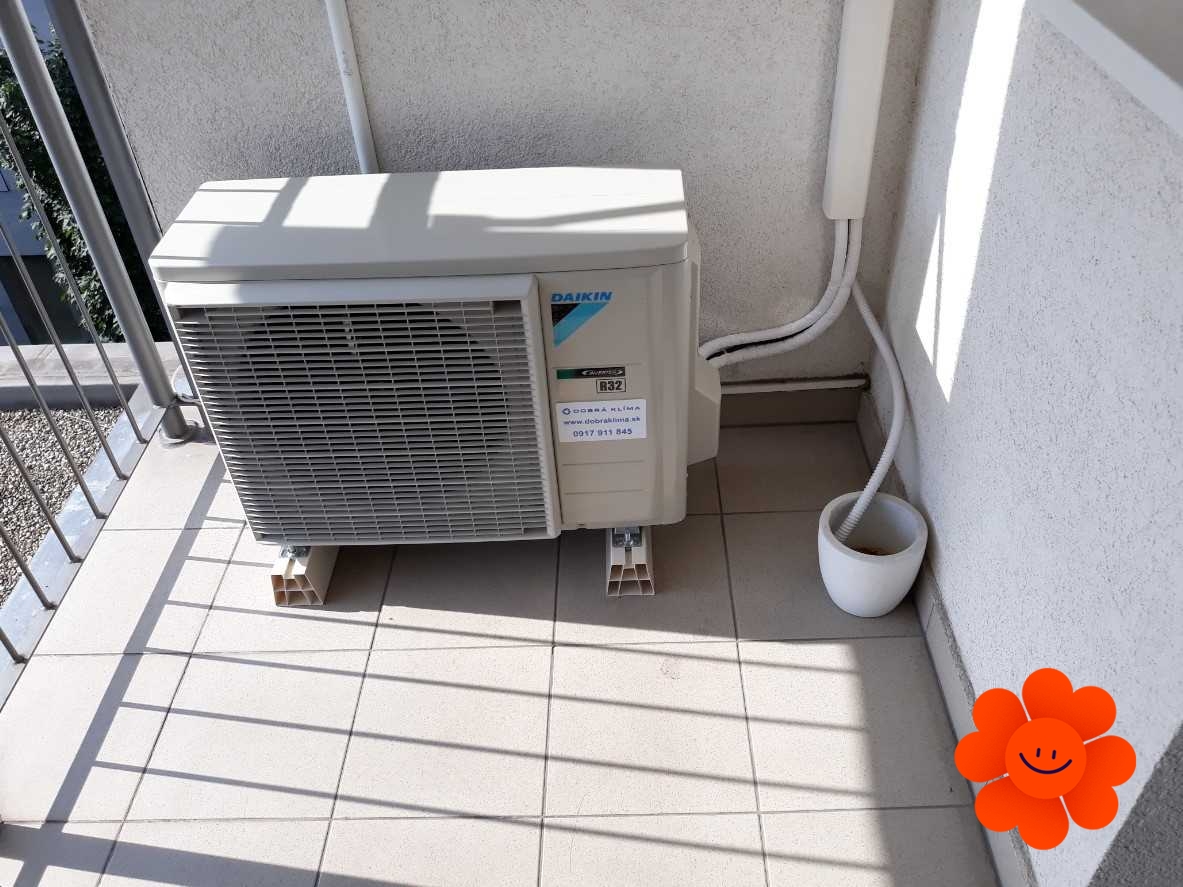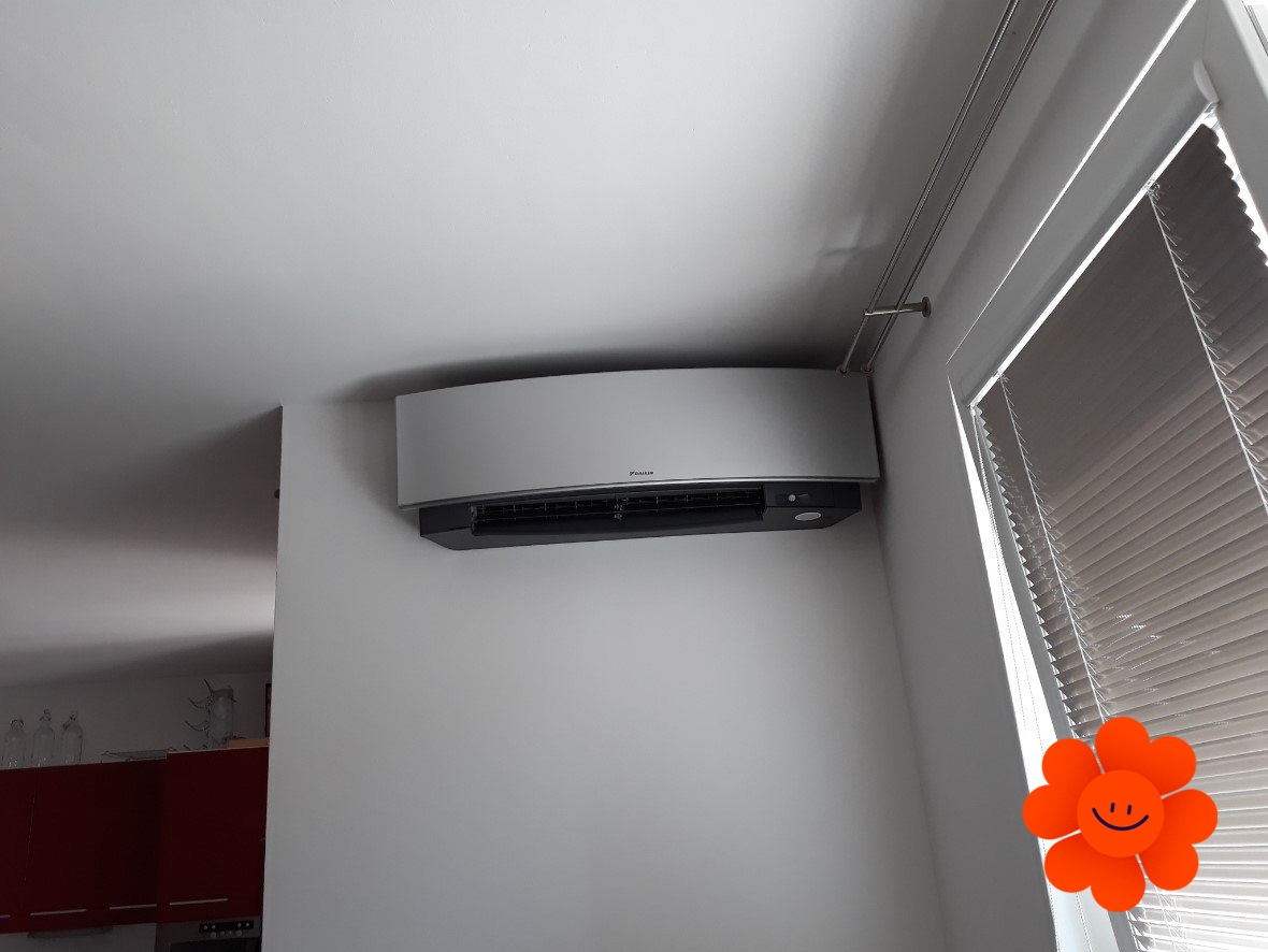 Montáž klimatizácie Daikin Emura do rohu v byte blízko balkóna. Rozvody vedú cez stenu priamo k vonkajšej jednotke, pričom sú kryté plastovým potrubím.