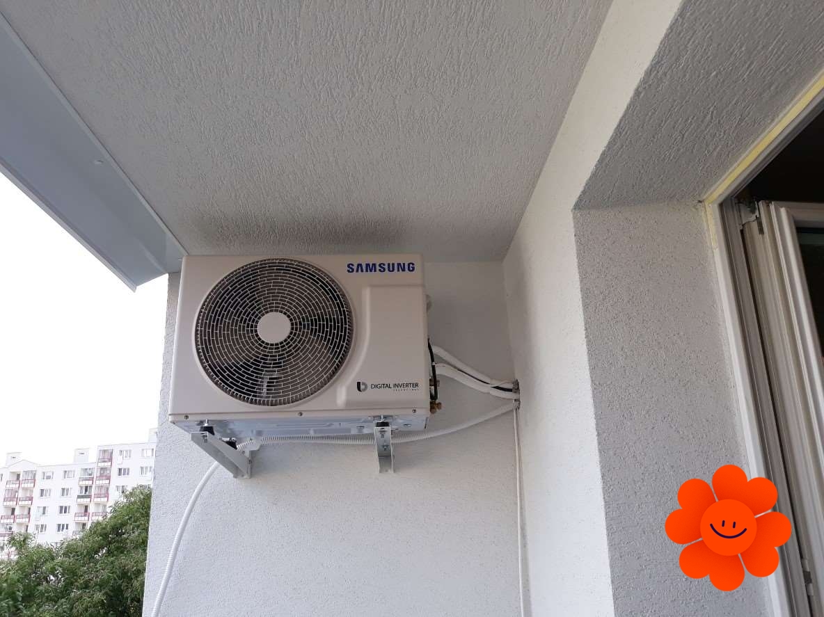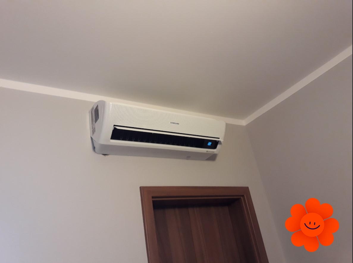 Montáž klimatizácie Samsung AR9500 Wind-Free Standard nad dvere v byte. Rozvody v plastovom potrubí vedú k vonkajšej jednotke.
