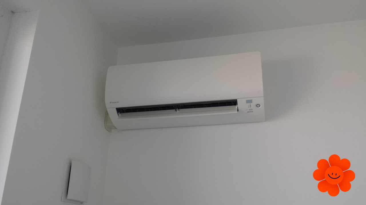 Montáž klimatizácie Daikin do bytu. Rozvody vedené cez stenu k vonkajšej jednotke umiestnenej na zemi.