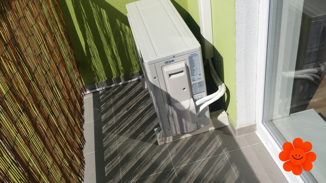 Montáž klimatizácie Samsung do bytu s umiestnením vonkajšej jednotky na balkón na podlahovú konzolu.