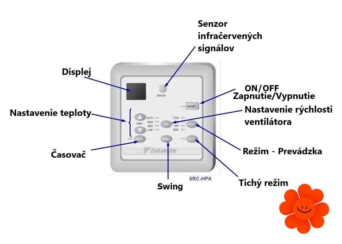 Umožňuje nastavenie základných riadiacich funkcií, ako nastavenie teploty, Tichý režim, Časovač, Funkcia Swing.