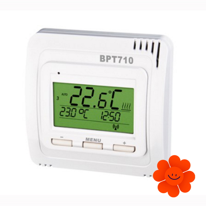 Elektrobock BT710 RF je bezdrôtový, priestorový, elektrický termostat, ktorý podľa požadovanej teploty v miestnosti ovláda prijímacie jednotky BT001, BT002 a BT003. Termostat je schopný ovládať až 9 spínacích prijímačov do vzdialenosti minimálne 35 metrov (v zástavbe). Termostat disponuje rozšírenými funkciami s možnosťou naprogramovania až 7 týždenných programov s 6 teplotnými zmenami za deň. Ovládanie je jednoduché pomocou dvoch tlačidiel, ktoré regulujú teplotu krokovo po 0,5 °C. Teplotnou reguláciou pripojeného spotrebiča môžete ušetriť až 30% energie.