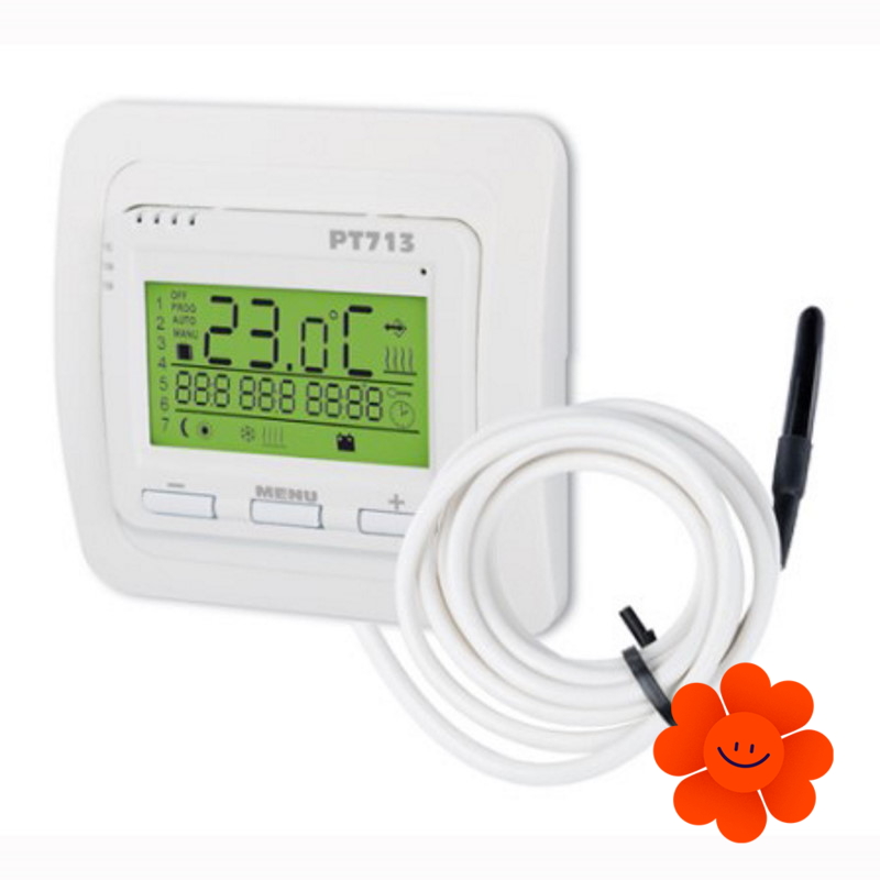Elektrobock PT713-EI je digitálny termostat, ktorý slúži na reguláciu elektrického podlahového kúrenia, ako sú vykurovacie káble, rohože či fólie. Termostat má zabudovaný aj externý snímač podlahy, vďaka ktorému môže regulovať podlahové kúrenie podľa priestorovej teploty (pre komfortnú teplotu v miestnosti), podlahovej teploty (napríklad v kúpeľniach kde chceme dosiahnuť vyššiu teplotu podlahy) alebo kombináciou oboch (komfortná teplota miestnosti a podlahy zároveň). Termostat funguje pomocou PI regulácie, vďaka ktorej nedochádza ku vysokým výkyvom teploty v čase a zároveň vie vyhodnotiť čas potrebný za dosiahnutie požadovanej teploty. Použitím termostatu je možné dosiahnuť tepelnú pohodu v danom čase a zároveň docielite zníženie nákladov na vykurovanie.
