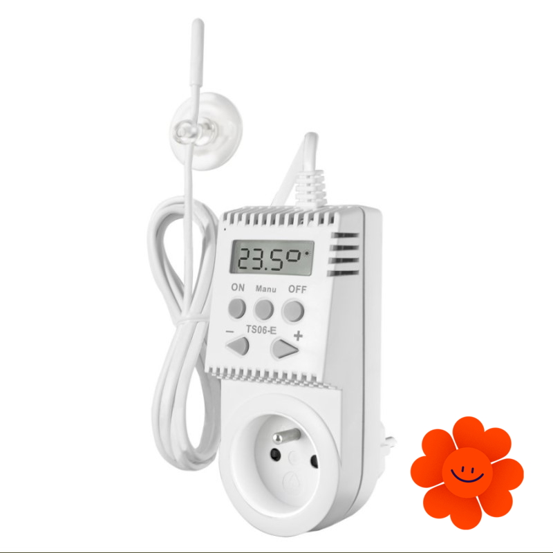 Elektrobock TS06-E je zásuvka s externým snímačom teploty, ktorou možno nastaviť teplotu na 3-40 °C. Externý snímač má dĺžku 1,6m a je možné ho umiestniť na iné miesto ako zásuvku, kde potrebujete merať teplotu. Ovládanie je jednoduché pomocou dvoch tlačidiel, ktoré regulujú teplotu krokovo po 0,5 °C. Na displeji nad tlačidlami sa po pripojení zásuvky zobrazuje aktuálna teplota v miestnosti. Zásuvka disponuje základnými funkciami, ktorými je možné jednoducho a pohodlne regulovať teplotu. Taktiež disponuje funkciou trvalého vypnutia spotrebiča (OFF).