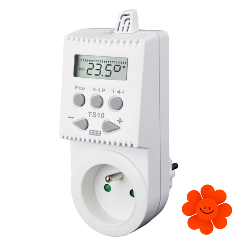 Elektrobock TS10 je digitálna tepelne spínaná zásuvka pre automatickú reguláciu elektrických vykurovacích spotrebičov, ktorou možno nastaviť teplotu na 3-40 °C. Ovládanie je jednoduché pomocou dvoch tlačidiel, ktoré regulujú teplotu krokovo po 0,5 °C. Na displeji nad tlačidlami sa po pripojení zásuvky zobrazuje aktuálna teplota v miestnosti. Zásuvka disponuje rozšírenými funkciami, ktorými je možné automaticky regulovať teplotné programy. Taktiež disponuje funkciou trvalého vypnutia spotrebiča (OFF). Automatickou teplotnou reguláciou pripojeného spotrebiča môžete ušetriť až 30% energie.