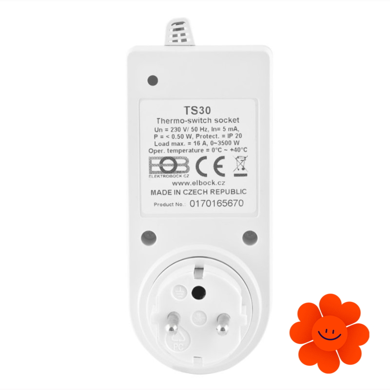 Elektrobock TS30 je digitálna tepelne spínaná zásuvka pre automatickú reguláciu elektrických vykurovacích spotrebičov, ktorou možno nastaviť teplotu na 5-39 °C. Ovládanie je jednoduché pomocou dvoch tlačidiel, ktoré regulujú teplotu krokovo po 0,5 °C. Na displeji nad tlačidlami sa po pripojení zásuvky zobrazuje aktuálna teplota v miestnosti. Zásuvka disponuje rozšírenými funkciami, ktorými je možné automaticky regulovať teplotné programy. Automatickou teplotnou reguláciou pripojeného spotrebiča môžete ušetriť až 30% energie. TS30 je vhodná do miest, kde sa využíva prepínanie nízkej a vysokej tarify. Krátkodobé vypínanie neskracuje životnosť prístroja a po obnovení napájania pokračuje vo zvolenom programe.