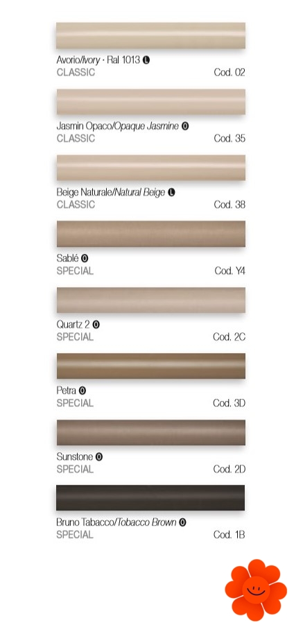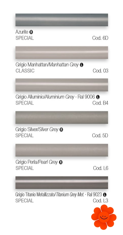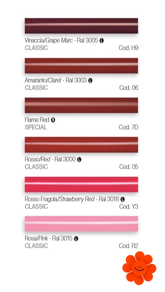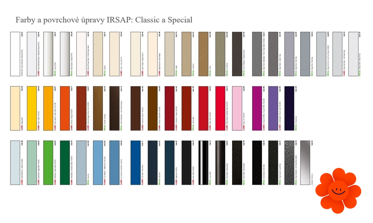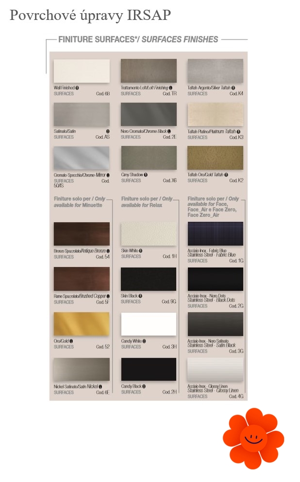 Uvedené farby sa nepovažujú za záväzné. Rôzne postupy v oblasti lakovacích technológií a materiály použité na realizáciu nemusia mať perfektnú farebnú zhodu s dodaným výrobkom. Spoločnosť Irsap si vyhradzuje právo kedykoľvek vykonať akékoľvek zmeny potrebné na zlepšenie produktu.