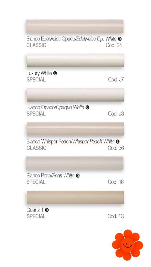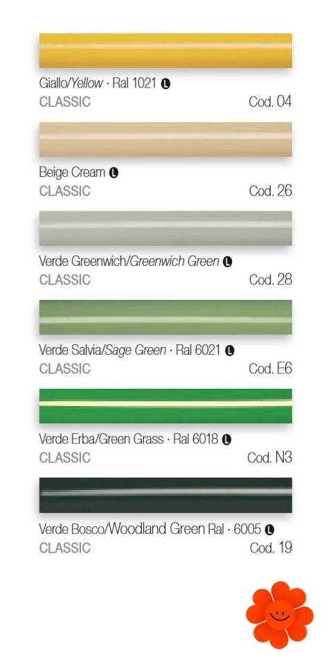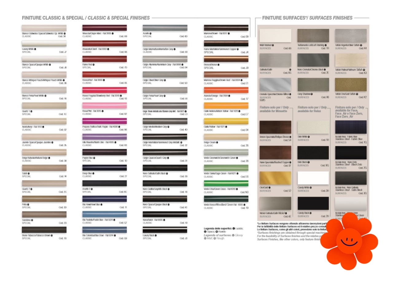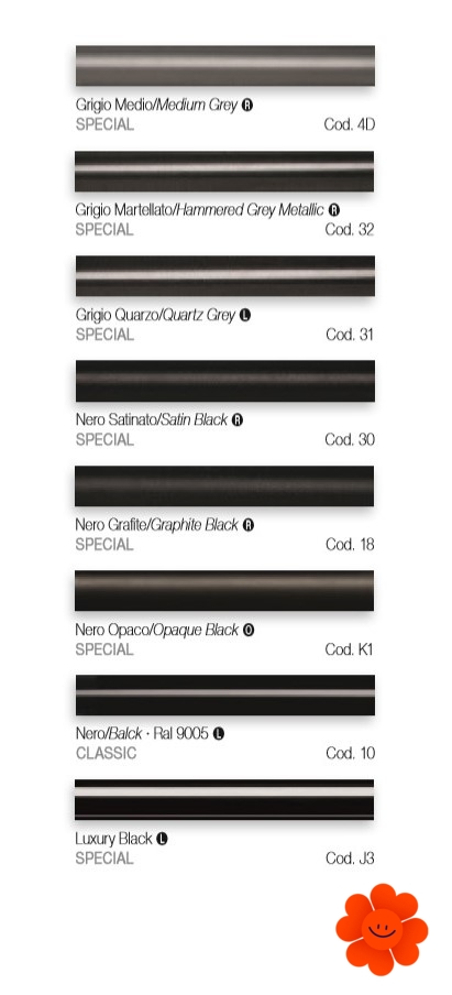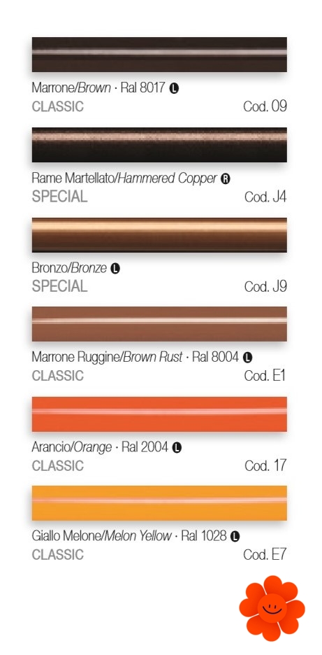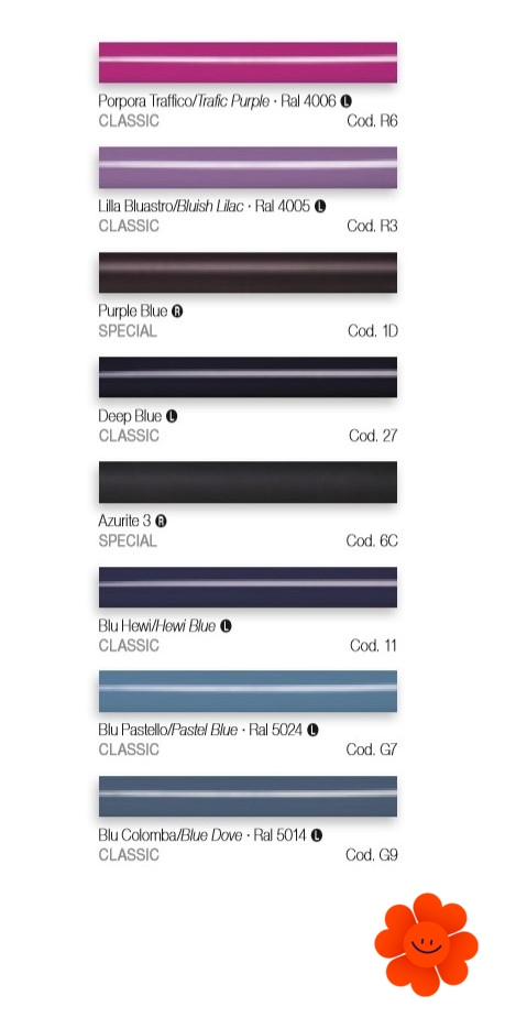 Uvedené farby sa nepovažujú za záväzné. Rôzne postupy v oblasti lakovacích technológií a materiály použité na realizáciu nemusia mať perfektnú farebnú zhodu s dodaným výrobkom. Spoločnosť Irsap si vyhradzuje právo kedykoľvek vykonať akékoľvek zmeny potrebné na zlepšenie produktu.