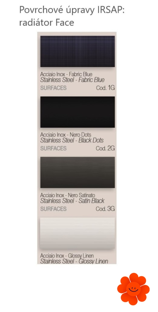 Radiátory z rady Face zase nájdete v exkluzívnych povrchoch z nehrdzavejúcej ocele, ktoré navrhlo štúdio Citterio.Vysoká kvalita je zaručená použitím najlepších medzinárodných značiek ekologických epoxidových živíc a jedného z najväčších špičkových technológií lakovacieho systému v Európe. Rafinované povrchové úpravy dodajú radiátorom Face eleganciu a jedinečnosť.