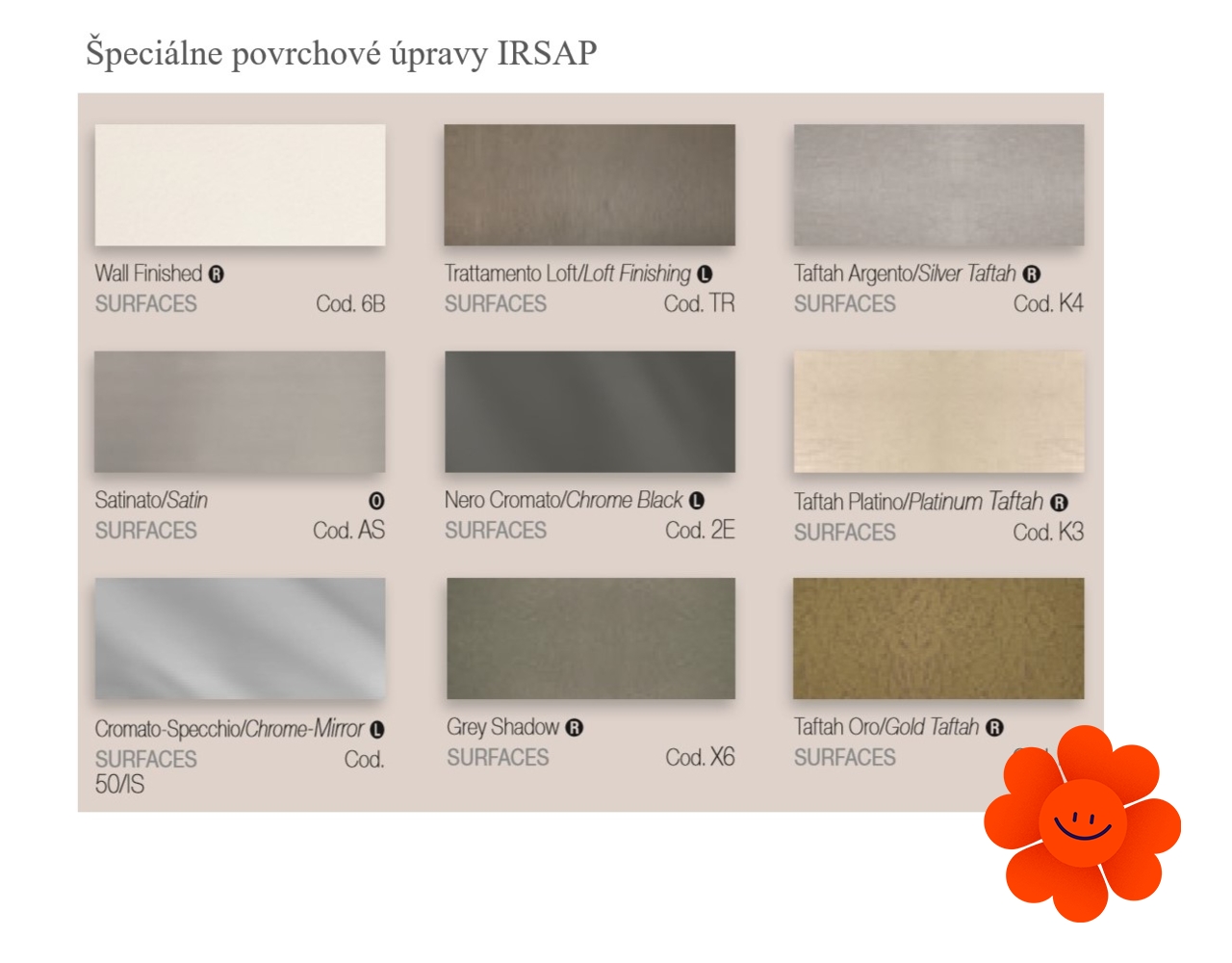 Povrchové úpravy a farebné prevedenia IRSAP sú farby špičkovej kvality na výber v lesklých (Glossy- L), matných (Matt - O) odtieňoch a v zrnitých autentických povrchoch (Rough – R).