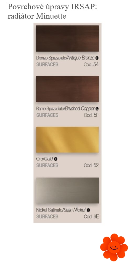 Radiátory IRSAP sa vyznačujú nápaditými a multifunkčnými vlastnosťami, vďaka rôznym tvarom, štýlom a povrchovým úpravám zapadnú aj do vašej domácnosti. Aby u vás dokonale ladili, na výber máte množstvo farebných prevedení. Farebné prevedenia z rady Irsap zaistia harmóniu s akýmkoľvek interiérovým štýlom.