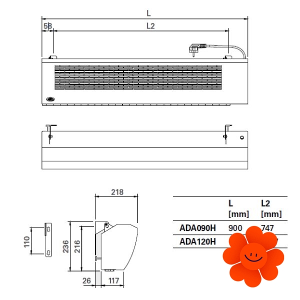 Model ADA090H predstavuje vzduchovú clonu bez ohrevu. Je vhodná do klimatizovaných priestorov. Vytvára ochrannú vzduchovú bariéru resp. neviditeľnú vzduchovú clonu, ktorá bráni vniknutiu teplého vzduchu, ale aj hmyzu, dymu, prachu či výfukových plynov. Odporúčaná montážna výška clony je 2,5 m. Tento model má šírku 0,9 m.