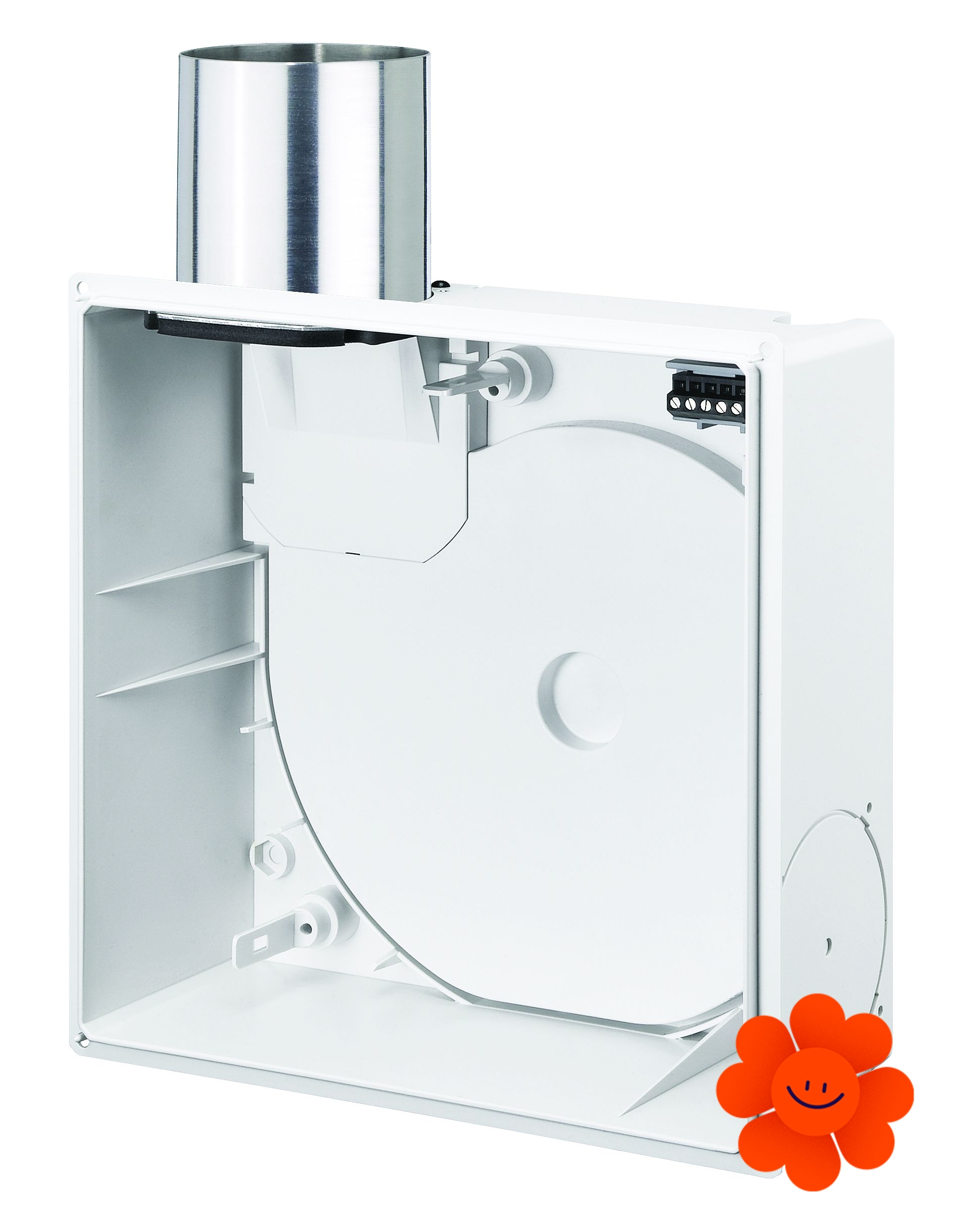 Montážna krabica Helios ELS-GUBA pod omietku s kovovým výfukovým hrdlom pre ventilátor ELS obsahuje zabudovanú požiarnu spätnú klapku EI90, ktorá sa aktivuje po uvoľnení tavnej poistky.