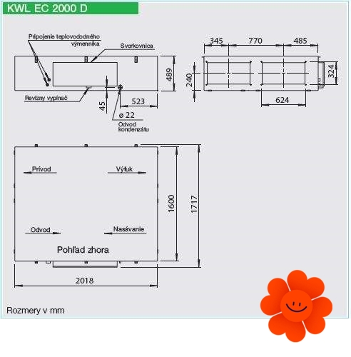 Podstropná rekuperačná jednotka Helios KWL EC 2000 D s protiprúdovým rekuperátorom je vhodná do prevádzok rôzneho typu a priemyselných objektov. Vyznačuje sa tým, že je extrémne plochá a dokáže odvetrať až 1900 m3 vzduchu za hodinu. Účinnosť spätného získavania tepla je viac ako 90%, čo znamená, že je energeticky veľmi šetrná. Dvierka sa nachádzajú na spodnej strane jednotky.