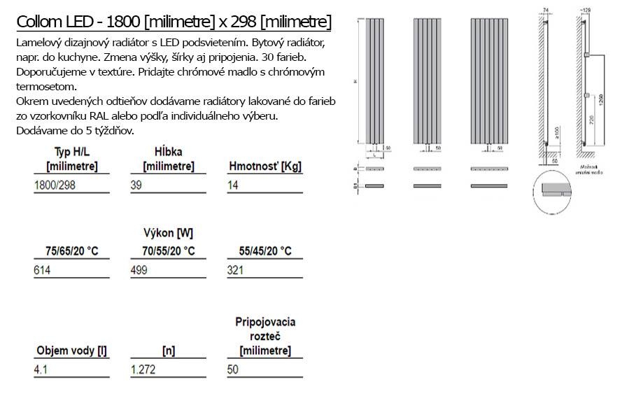Dizajnový radiátor Collom sa stane funkčným architektonickým prvkom vášho interiéru. S okolitým priestorom ho môžete prepojiť farebne. Ponúkame 30 farieb. Odporúčame pridať chrómové madlo a chrómový termoset.