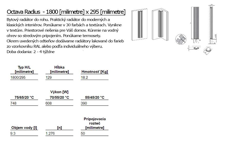 Moderný radiátor do rohu si môžete prispôsobiť farebne podľa farieb vášho interiéru. Ponúkame v 30 farbách vrátane textúr a metalíz bez príplatku.
