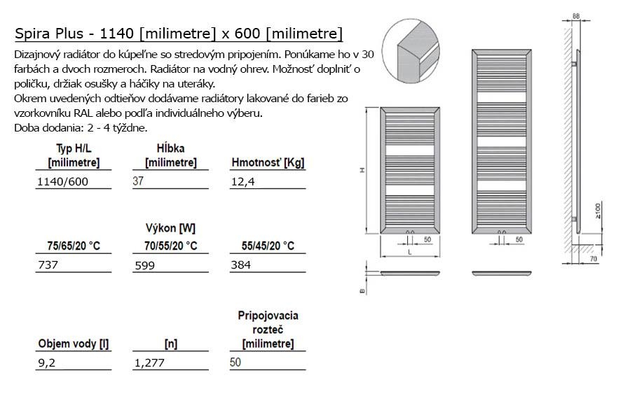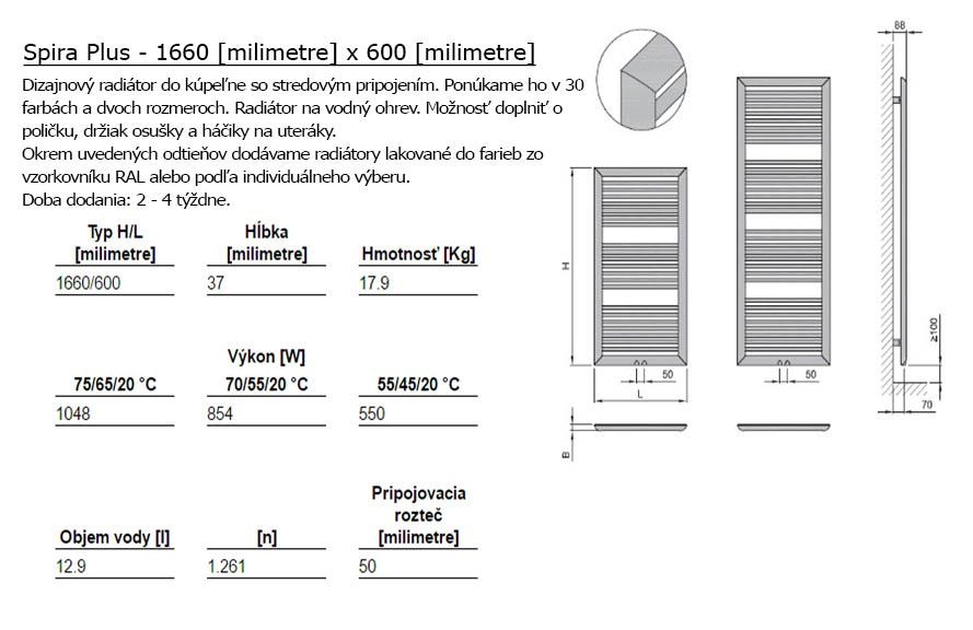 Spira PLUS ponúka veľmi dobrú výhrevnosť pomocou vodného ohrevu. Vyberte si z dvoch rozmerov tohto radiátora. Dodávame so stredovým pripojením.