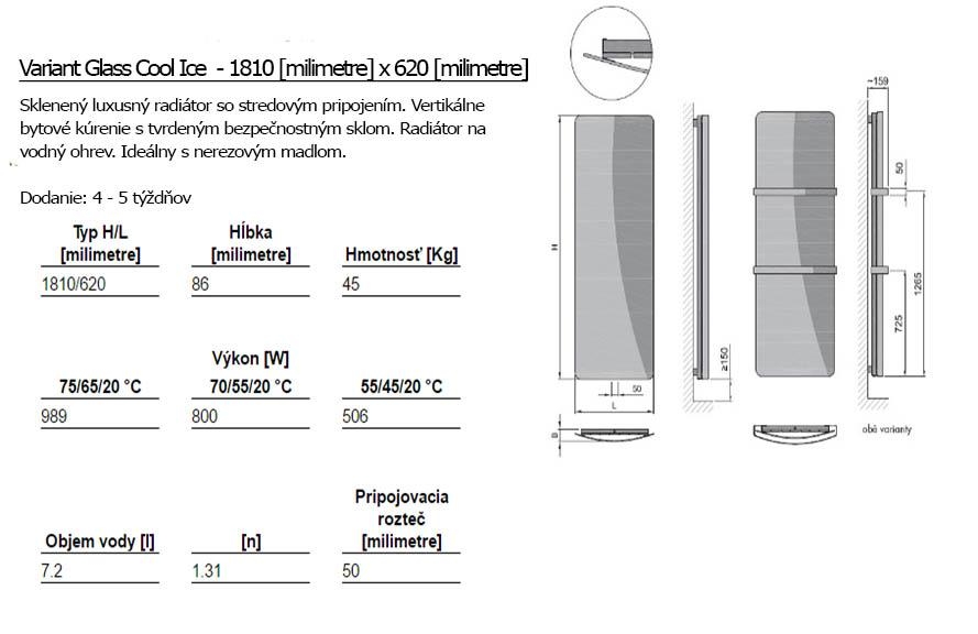 Dizajnové kalené bezpečnostné sklo so zaobleným tvarom skrýva výkonné oceľové trubky. Variant Glass je zárukou vysokej kvality, rýchleho ohrevu miestnosti a vysokého vykurovacieho výkonu. Máte možnosť doplniť chrómové madlo a chrómový termoset.
