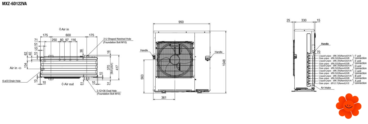 Vonkajšia jednotka MXZ-6F120VF je vhodná na aplikáciu ako Multisplit pre 6 miestností. Tvorí ju energeticky úsporný rotačný piestový kompresor s chladiacim výkonom 12,2 kW.