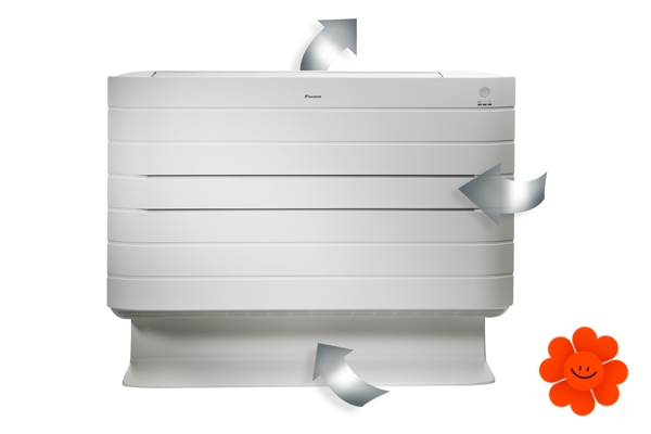 Výstup vzduchu je umiestnený na hornej strane klimatizácie. Nasávanie vzduchu je na spodných paneloch.