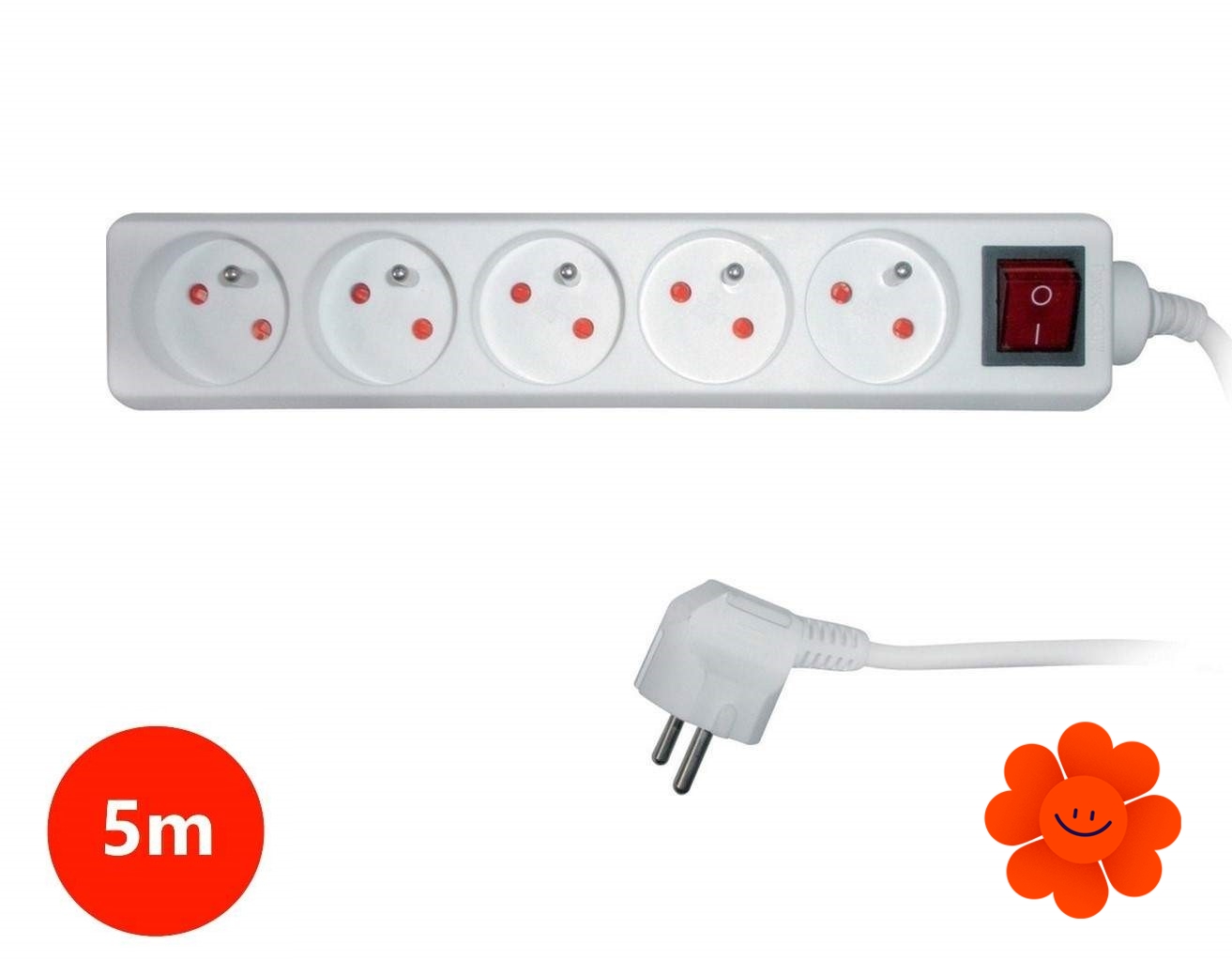 Šnúra, kábel je bielej farby s dĺžkou 5 metrov, 5x zásuvka s vypínačom.