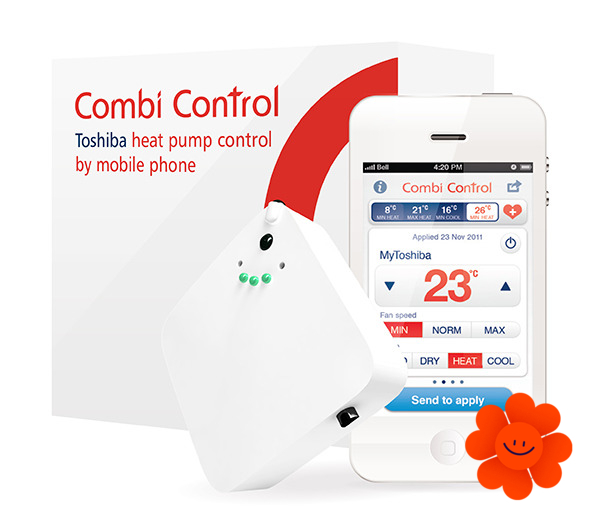 Zariadenie Combi Control prijíma cez GSM pomocou SIM karty (nie je súčasťou dodávky) príkazy zo Smartphonu (cez aplikáciu), alebo pomocou SMS správ príkazy, ktoré potom pomocou infra vysielača pošle vnútornej jednotke. Tak je možné externé ovládanie klimatizačných zariadení TOSHIBA bez toho, aby bolo potrebné internetové pripojenie.