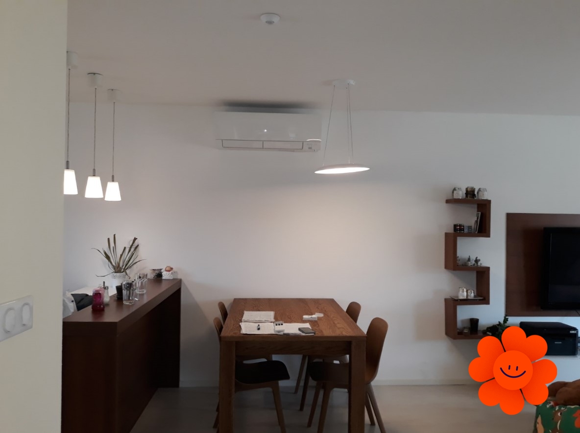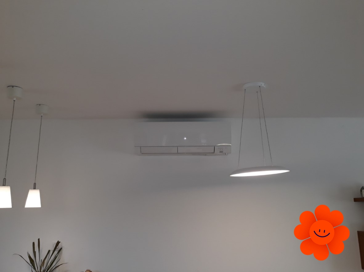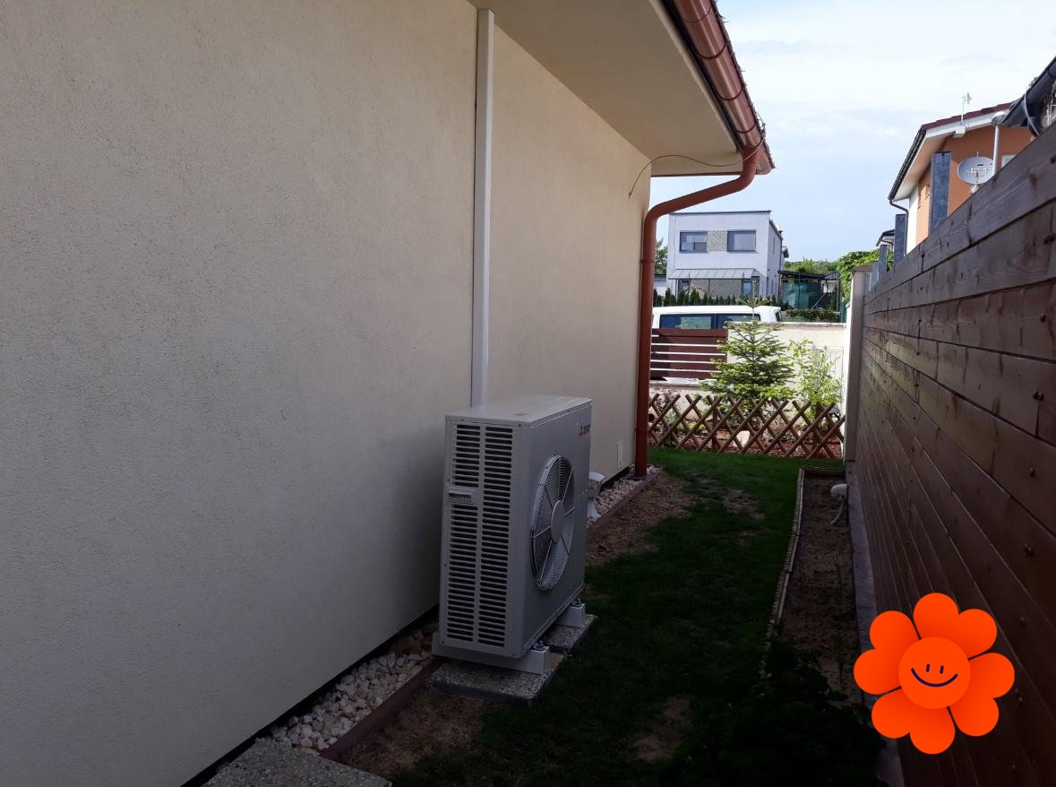 Montáž klimatizácie Mitsubishi Deluxe MSZ-FH v rodinnom dome s ukotvením na stene. Rozvody vedené v plastovom potrubí k vonkajšej jednotke.