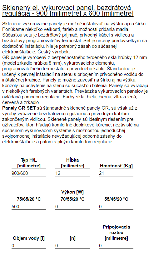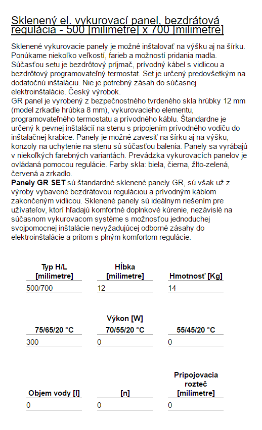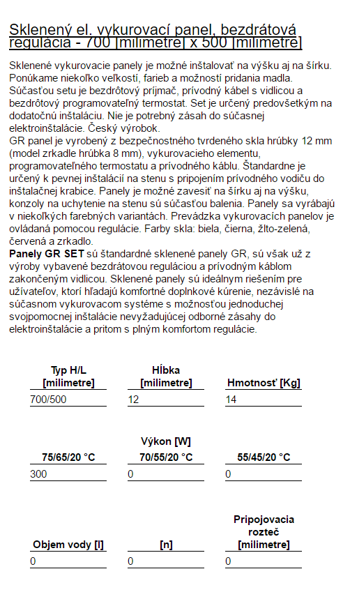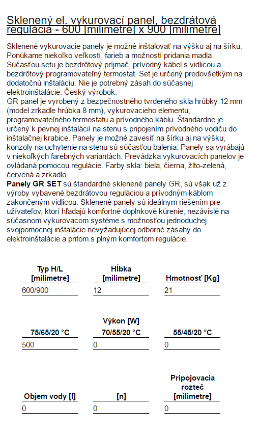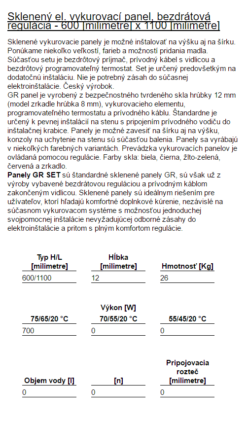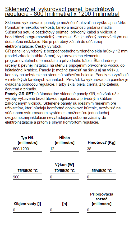 Sklenené vykurovacie panely je možné inštalovať na výšku aj na šírku. Ponúkame niekoľko veľkostí, farieb a možností pridania madla. Súčasťou setu je bezdrôtový príjmač, prívodný kábel (biely o dĺžke 1,9 m) s vidlicou a bezdrôtový programovateľný termostat.