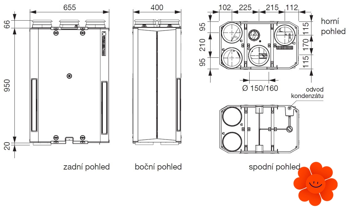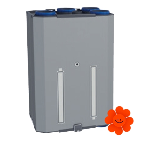 Kryt je vyrobený z odolného extrudovaného polystyrénu XPS a vrchná časť jednotky je z oceľového plechu v šedom odtieni. Jednotka má 4 horné a 2 spodné kruhové hrdlá na vývod vzduchu pre potrubia s priemerom Ø150 a Ø160. Otvor protimrazovej klapky má priemer Ø80.