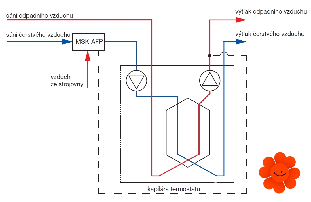 Klapka MSK-AFP sa montuje vždy do prívodného potrubia vonkajšieho vzduchu do jednotky podľa schémy. Montáž klapky je možná v akejkoľvek polohe a musí byť umiestnená tak, aby bol umožnený prístup k svorkovnici, termostatu a servopohonu. Kapilára termostatu sa montuje do potrubia odpadového vzduchu. Kapilára sa nesmie ostro ohýbať (min. polomer ohybu je 20 mm).