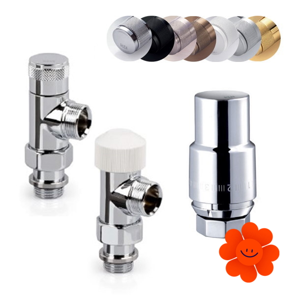 Reverzná termostatická dizajnová sada - pár 0634+0674+N093 (prívodný ventil, odvodný ventil, hlavica Domus a 2x šróbenie).