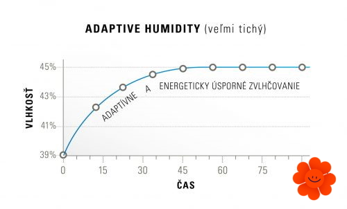 • Automatický režim - adaptívne zvlhčovanie, kedy si sám reguluje výkon na základe rozdielu medzi cieľovou a aktuálnou vlhkosťou vzduchu