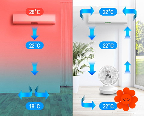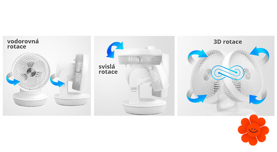 - 3D oscilácia so širokým rozsahom – otáčanie ventilátora v uhle 30°, 60°, 90°. Menší uhol umožňuje lepšie zacielenie napr. na osobu, zatiaľ čo maximálny uhol využijete na rovnomernú distribúciu vzduchu po celej šírke miestnosti.
