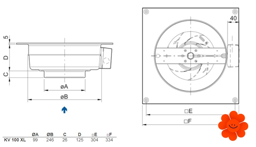 Systemair KV 100 XL sileo kruhový ventilátor je určený pre montáž na stenu alebo strop s možnosťou pripojenia kruhového potrubia na odvádzanie vzduchu. Motor má vonkajší rotor a obežné kolesá s lopatkami zahnutými dozadu. Motor ventilátora má pre svoju ochranu vstavané tepelné kontakty s manuálnym resetom.