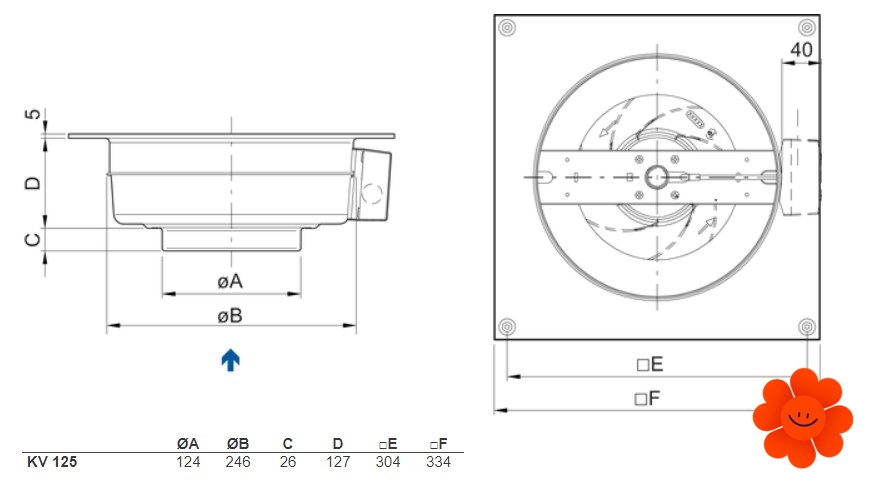 Systemair KV 125 XL sileo kruhový ventilátor je určený pre montáž na stenu alebo strop s možnosťou pripojenia kruhového potrubia na odvádzanie vzduchu. Motor má vonkajší rotor a obežné kolesá s lopatkami zahnutými dozadu. Motor ventilátora má pre svoju ochranu vstavané tepelné kontakty s manuálnym resetom.