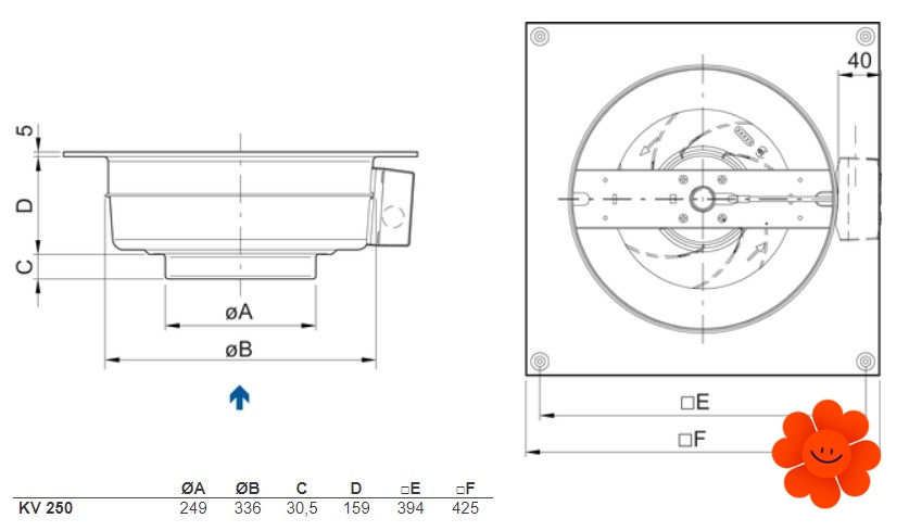 Systemair KV 250 L sileo kruhový ventilátor je určený pre montáž na stenu alebo strop s možnosťou pripojenia kruhového potrubia na odvádzanie vzduchu. Motor má vonkajší rotor a obežné kolesá s lopatkami zahnutými dozadu. Motor ventilátora má pre svoju ochranu vstavané tepelné kontakty s manuálnym resetom.