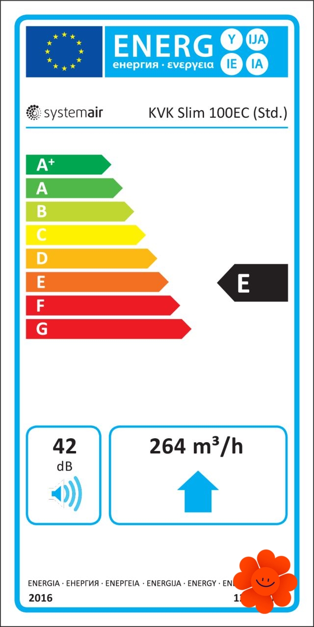 Kruhový ventilátor Systemair KVK Slim 100EC spĺňa minimálnu požiadavku na energetickú účinnosť podľa smernice ERP.