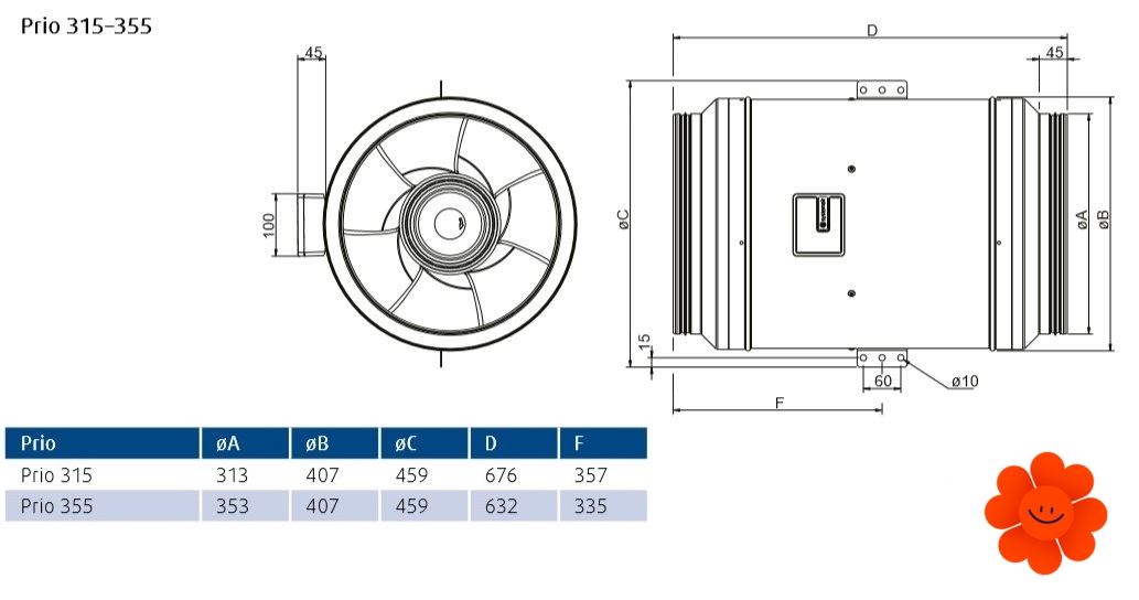 Systemair prio 355 AC kruhový ventilátor je určený pre montáž do potrubia. Motor má diagonálne, aerodynamicky optimalizované obežné kolo s vysokou účinnosťou a nízkou hladinou hluku. Motor má pre svoju ochranu vstavané tepelné kontakty vyvedené na externú svorkovnicu, ktoré musia byť pripojené na zodpovedajúce relé tepelnej ochrany.