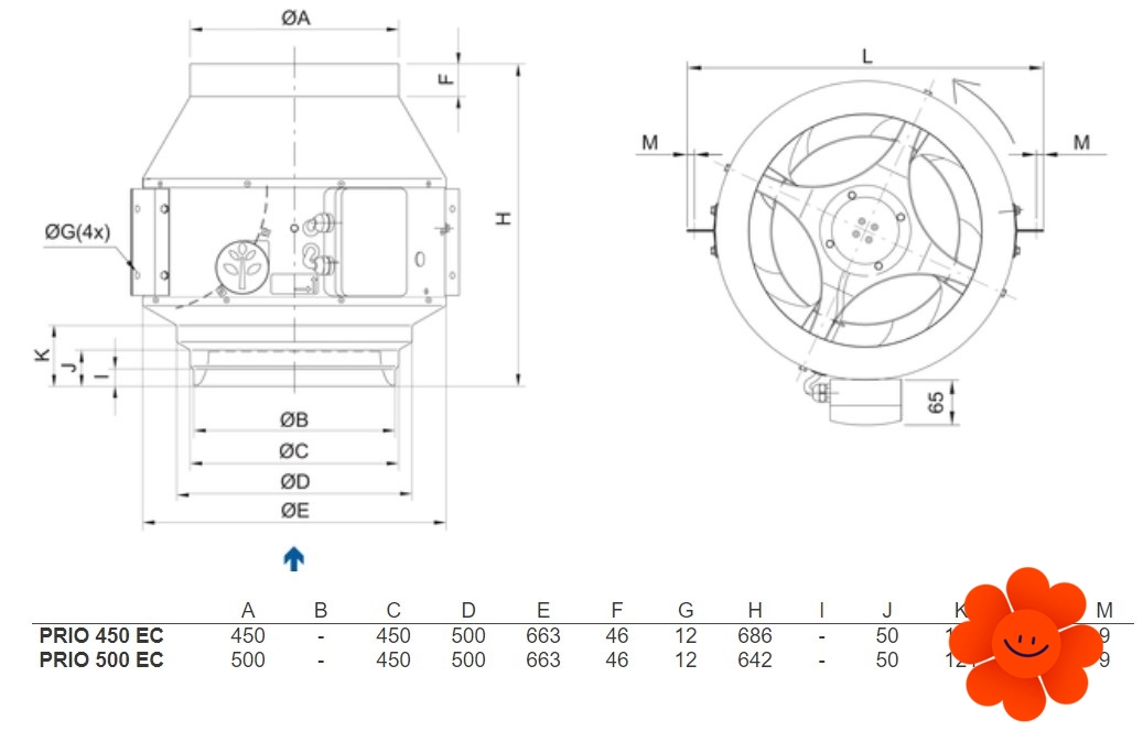 Systemair prio 450 3~ EC kruhový ventilátor je vybavený nízkoenergetickým EC motorom s externým rotorom. Nielenže dosahuje vysoké vzduchové výkony, ale vďaka diagonálnemu obežnému kolesu je možná aj redukcia vonkajších rozmerov ventilátora.