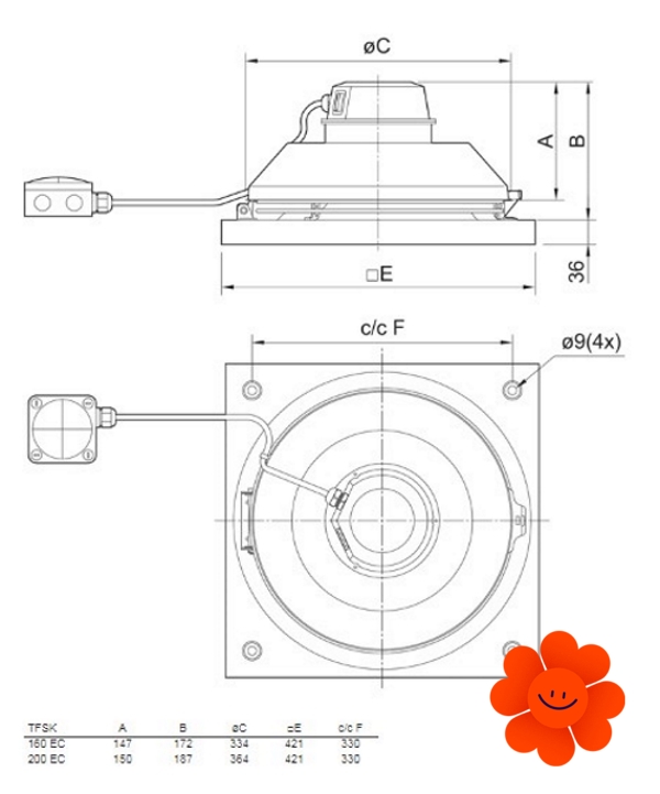Strešný ventilátor TFSK 200 EC má štvorcovú základovú dosku.