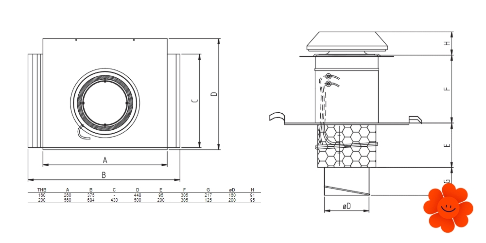 THB je vyrobené z pozinkovaného oceľového plechu s čiernym alebo tehlovo červeným práškovým náterom. Súčasť dodávky tvorí základová doska TUB, ktorá sa montuje na vnútornú stranu strechy, čím zamedzuje prenikaniu vody cez otvor v streche.