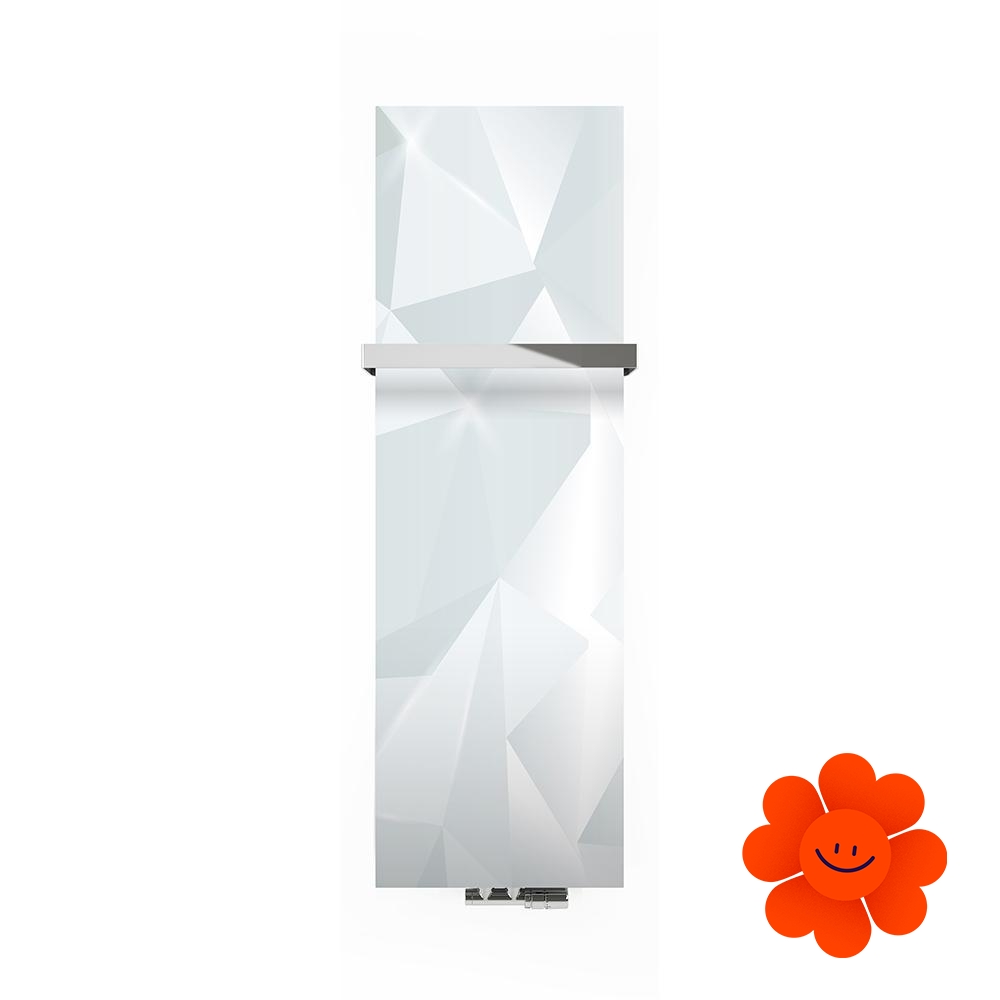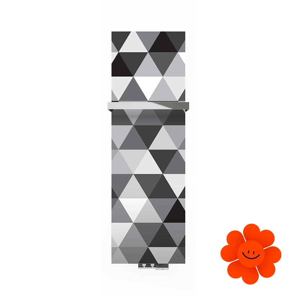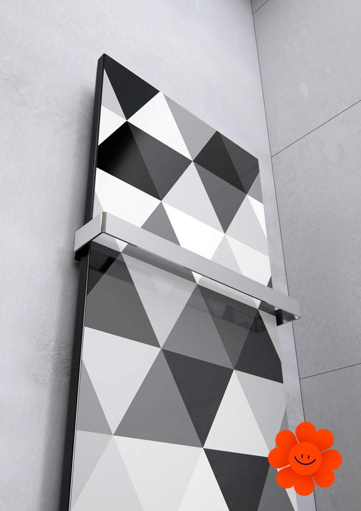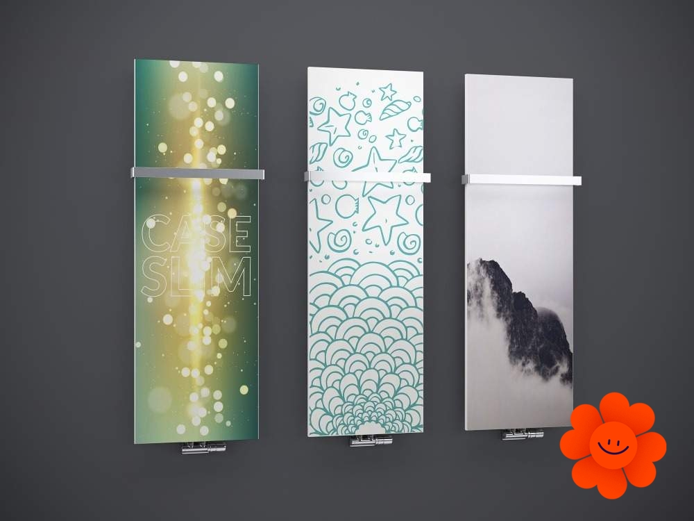 Radiátor sa vyrába buď ako čisto sklenená varianta alebo varianta s potlačou. Potlač na čelnej sklenenej tabuli urobí z vášho radiátora skutočne originálny kus. Môžete si vybrať z ponuky predvolených vzorov alebo je možné použiť i vlastnú originálnu grafiku. K dispozícii je viac ako 250 farieb pre bočné strany radiátora.