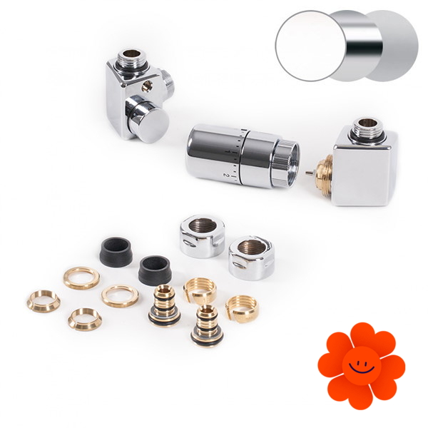 Pravá termostatická uhlová sada obsahuje: termostatický ventil, uzatvárací ventil, termostatickú hlavicu SLIM, adaptéry AL-PEX ∅ 16x2 a meď ∅ 15.