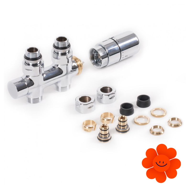 Stredová priama ľavá termostatická dizajnová sada obsahuje: integrovaný termostatický stredový ventil, termostatickú hlavicu SLIM, adaptéry AL-PEX ∅ 16x2 a meď ∅ 15.